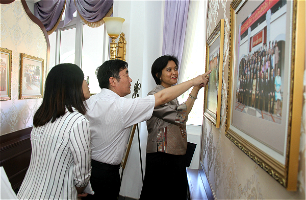 甘迪满总领事在胡培安院长的陪同下,参观了诗琳通图书馆,详细了解了馆内珍藏的泰国王室诗琳通公主莅临华侨大学及华文学院交流的图片。她表示,自今年五月任泰王国驻厦门总领事来,第一次正式访问高校,感谢华文学院领导的接待。诗琳通图书馆是中泰两国关系友好的体现,领事馆愿意在图书馆整修、泰文书籍或者教学设备等方面给予支持,以利于两国学生更好地交流。