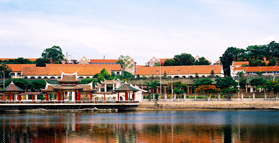 华文学院坐落于闻名遐迩的厦门市集美学村。校园占地六万多平方米,依山傍海,风光旖旎,交通便利。20幢具有“嘉庚风格”的中西合璧式建筑由低到高、整齐雅致地排列于校园内,成为一道极具特色的建筑景观。