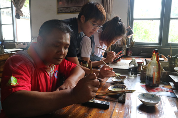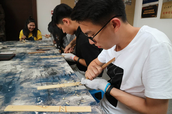 从古至今在徽州土地上,涌现出了一代代技艺卓越的能工巧匠,他们用勤劳灵巧的双手缔造了不朽的作品。徽文化博物馆里,精美绝伦的徽州雕刻、文房四宝、徽州版画、徽州刺绣令同学们惊叹不已。为了让同学们亲身体悟徽文化中蕴藏的工匠精神,在徽字号非遗传习所同学们在雕刻大师的指导下亲手雕刻了竹简,小试牛刀的同学们显得有些吃力,最终同学们齐心协力完成了“礼仪徽州,梦幻黄山”、“读万卷书,行万里路”两幅雕刻作品。在有百年历史的胡开文墨厂,同学们见识了雕模、点烟、制墨、晾墨、打磨、描金等工序制作,并亲手为徽墨描金。来自印尼的李伟汉说:“这几天参观中的工艺品十分精美,自己亲身体验后才明白中国的工匠精神很可贵,我们学习汉语文化都需要工匠精神。”