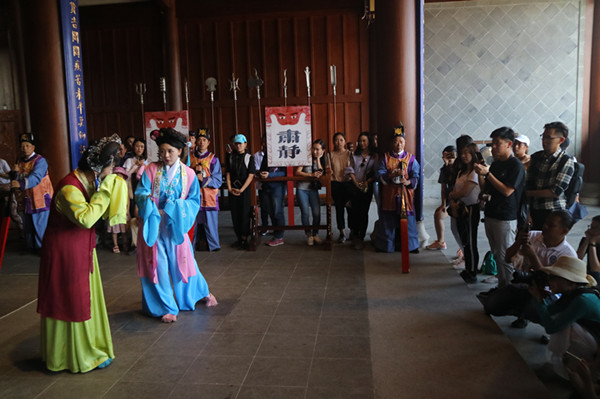 为了探访徽州文化的源头,同学们首先参观了“徽学”发祥地——徽州古城,徽州府、许国石坊、徽商花园、渔梁坝、陶行知纪念馆沉淀记载着徽商、徽官、徽班以及徽州教育的故事,同学们充满好奇、悉心聆听。古城里同学们欣赏了徽州民间精品剧目《三戒碑》,行程中还特意邀请了徽剧团队教授同学们演绎黄梅戏,同学们认真模仿着唱腔和手势,演绎了《天仙配》的片段。